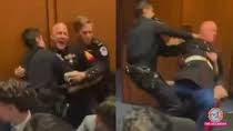 तेल अवीव/तेहरान।अमेरिका-इजराइल और ईरान जंग का आज छठा दिन है। इस बीच अमेरिकी संसद में आर्म्ड फोर्स से जुड़ी की सुनवाई के दौरान उस समय हंगामा हो गया जब अमेरिकी सांसद टिम शीही ने प्रदर्शन कर रहे पूर्व मरीन सैनिक ब्रायन मैकगिनिस को बैठक से बाहर निकलवाया।इस दौरान सुरक्षा कर्मियों ने उसे जबरन बाहर निकालने की कोशिश की, जिसमें उसका हाथ टूट गया। रिपोर्ट के मुताबिक ब्रायन मैकगिनिस अमेरिका के ईरान के खिलाफ युद्ध में शामिल होने के फैसले का विरोध कर रहे थे।सुनवाई के दौरान अचानक उन्होंने चिल्लाते हुए कहा, ‘अमेरिका इजराइल के लिए यह युद्ध नहीं लड़ना चाहता।’ इसके बाद कैपिटल पुलिस ने उन्हें बाहर निकालने की कोशिश की इस दौरान रिपब्लिकन सीनेटर टिम शीही भी पुलिस के साथ उन्हें बाहर धकेलने में शामिल हो गए।बताया जा रहा है कि लगभग 20–30 सेकंड तक पुलिस और सीनेटर उन्हें दरवाजे से बाहर निकालने की कोशिश करते रहे। इस दौरान मैकगिनिस ने दरवाजे को पकड़कर विरोध जारी रखा और नारे लगाते रहे। इसी खींचतान के दौरान उनका हाथ दरवाजे में फंस गया और टूट गया।