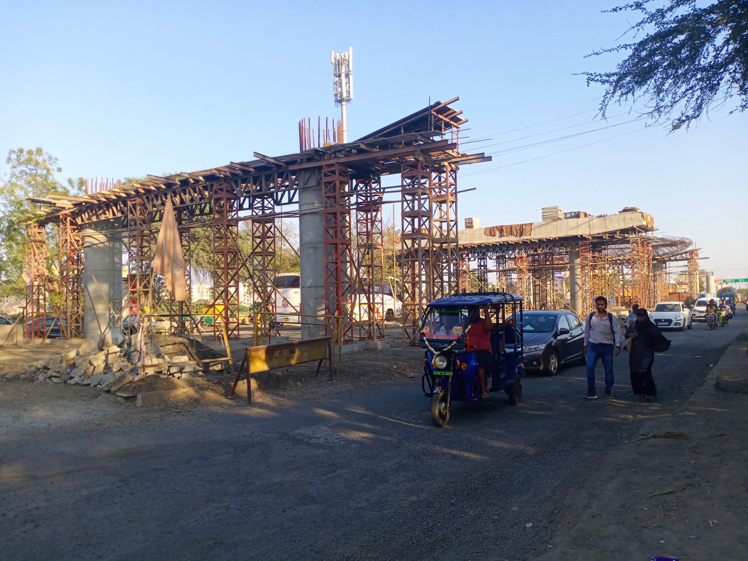 निर्माणाधीन पुल के नीचे से आवाजाही, लोगों की जान जोखिम में निर्माणाधीन पुल के ऊपर क्रेन वजनी सामान चढ़ाती रहती है और पुल के नीचे से वाहन निकलते रहते हैं